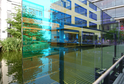 Transparency and light, color plays and incomparable reactions to light give a new image to architectural spaces. Interiors are exposed and are nevertheless optically separated from each other. Dichroic glass can give new insights and make new design concepts possible, wherever they are desired. Appearing weightless, but of tremendous stability, glass is the ideal material for the elegant division of areas in spatial arrangement. Dichrois coated glasses appear to be transparent at one moment, but from a new angle and in the next moment, a new color variable appears.